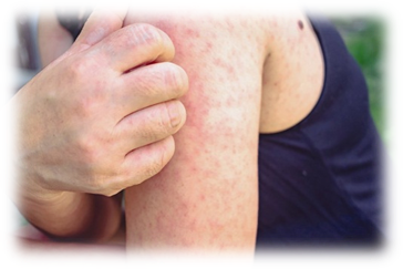 Как правило, на четвертый день появляется сыпь (экзантема) на теле — сначала на лице и шее, затем распространяется на руки, спускается на туловище и ноги. Сыпь обильная, пятнисто-папулезная, характерного красного цвета, элементы яркие, крупные, склонные к слиянию, кожа вокруг обычной окраски.