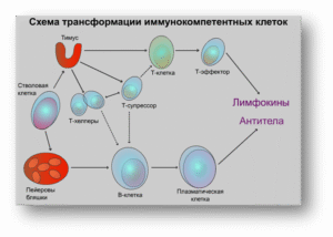 Не забудем и об иммунокомпетентных клетках  (лимфоциты, моноциты, полинуклеарные лейкоциты, белые отросчатые эпидермоциты кожи – клетки Лангерганса), способных распознавать все чужеродное по его химической структуре, обрабатывать и сохранять эту информацию, передавать другим клеткам,  формировать на своей поверхности строго специфические белки иммуноглобулины, которые затем и станут антителами. Конечно, у человека это 2 основные популяции: Т-лимфоциты, созревающие в вилочковой железе /лат. Thymus/, и В-лимфоциты, созревающие в костном мозге или лимфоидной ткани кишечника (аналог сумки Фабрициуса у птиц /лат. Bursa/).