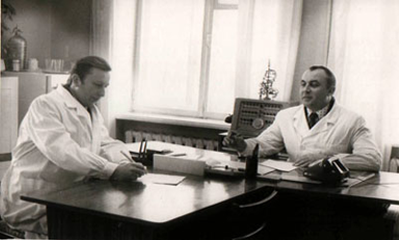 - Главный врач Слуцкой СЭС Колядко Павел Иванович и заведующий санитарно-гигиеническим отделом Лукьянов Владимир Александрович. Обсуждение текущих вопросов, 1977 год