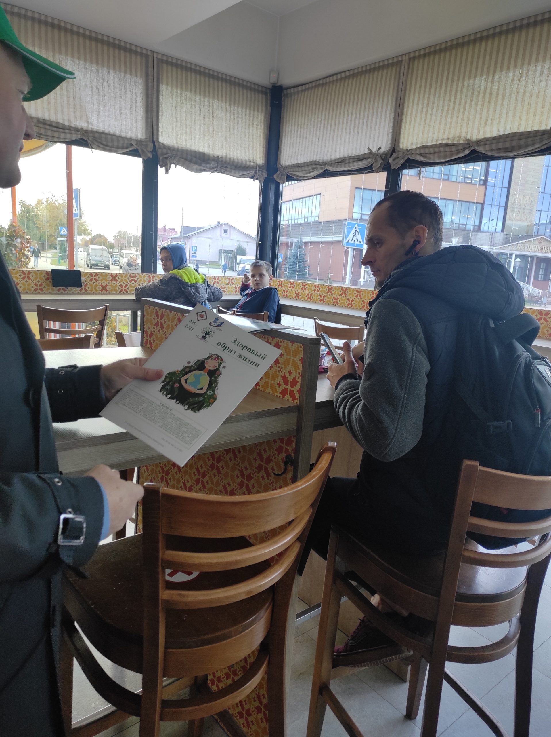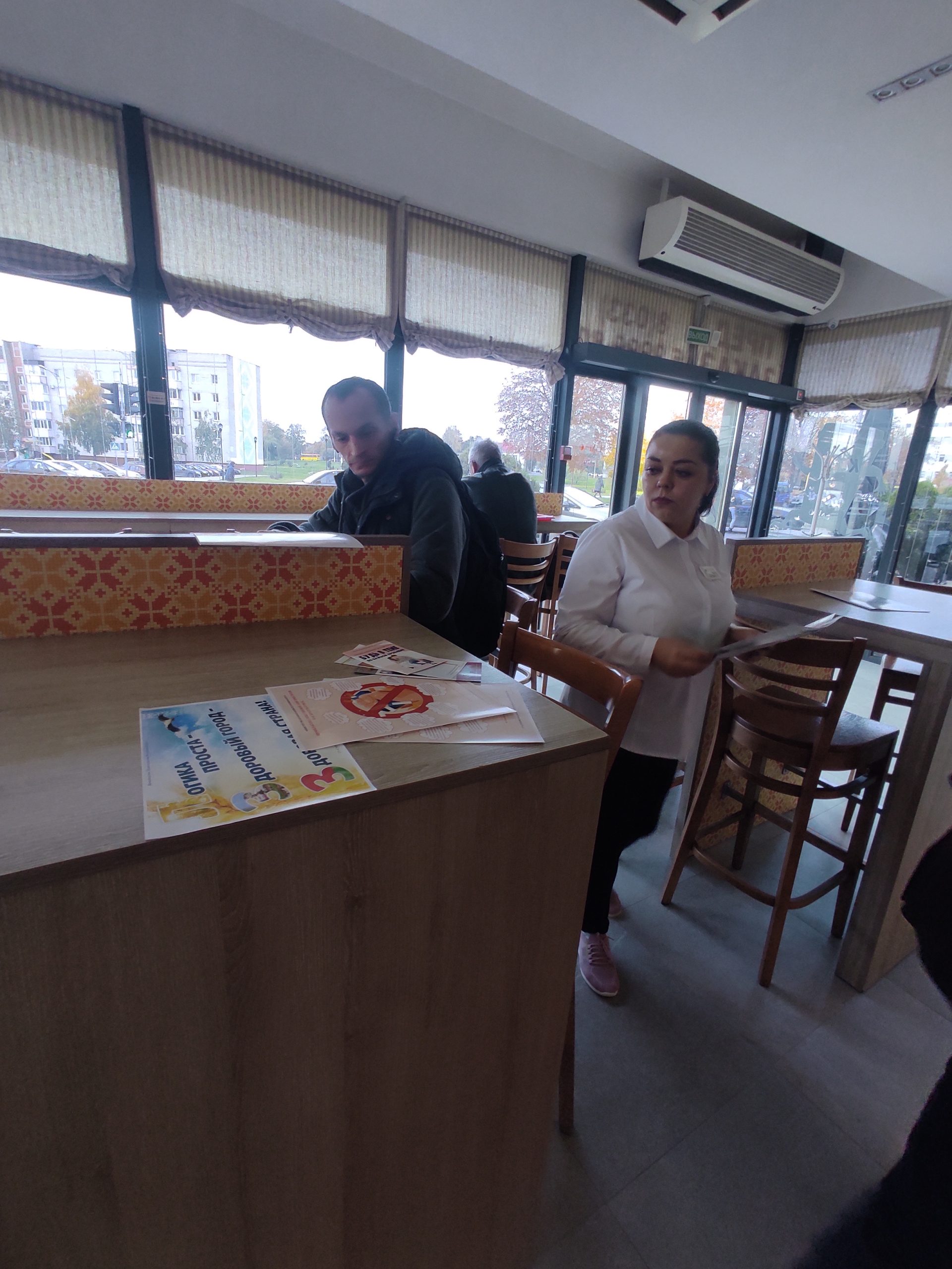 18.10.2023 Специалистами отделения общественного здоровья ГУ «Слуцкий зональный центр гигиены и эпидемиологии» проведена информационно – просветительная акция «За здоровый образ жизни» в кафе «БЛИНО» (г. Слуцк, ул. Комсомольская).