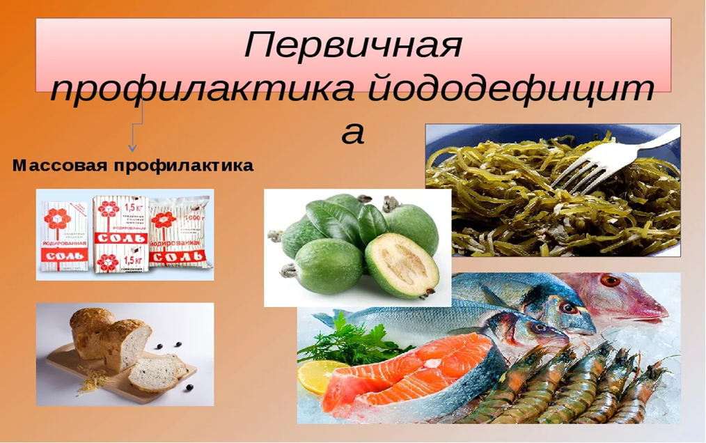 - Включение в меню организованных коллективов (дошкольные и общеобразовательные организации) продуктов богатых йодом: хек серебристый, пикша, лосось, камбала, треска, морской окунь, морская капуста.