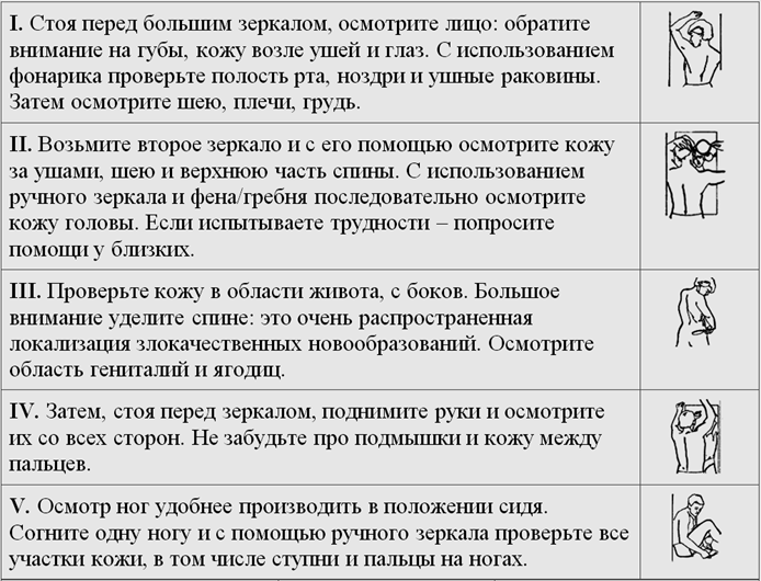 Сделать самостоятельный осмотр более быстрым и удобным помогут следующие рекомендации. Лучшее время для осмотра – после принятия душа или ванны. Используйте 2 зеркала: в полный рост и небольшое, желательно с длинной ручкой – их комбинация позволяет рассмотреть все участки тела. Также для осмотра головы потребуется расчёска/гребень или фен (с их помощью можно обнажить участи кожи под волосяным покровом). Осмотр необходимо производить в хорошо освещенном помещении, возможно, потребуется также небольшой фонарик.